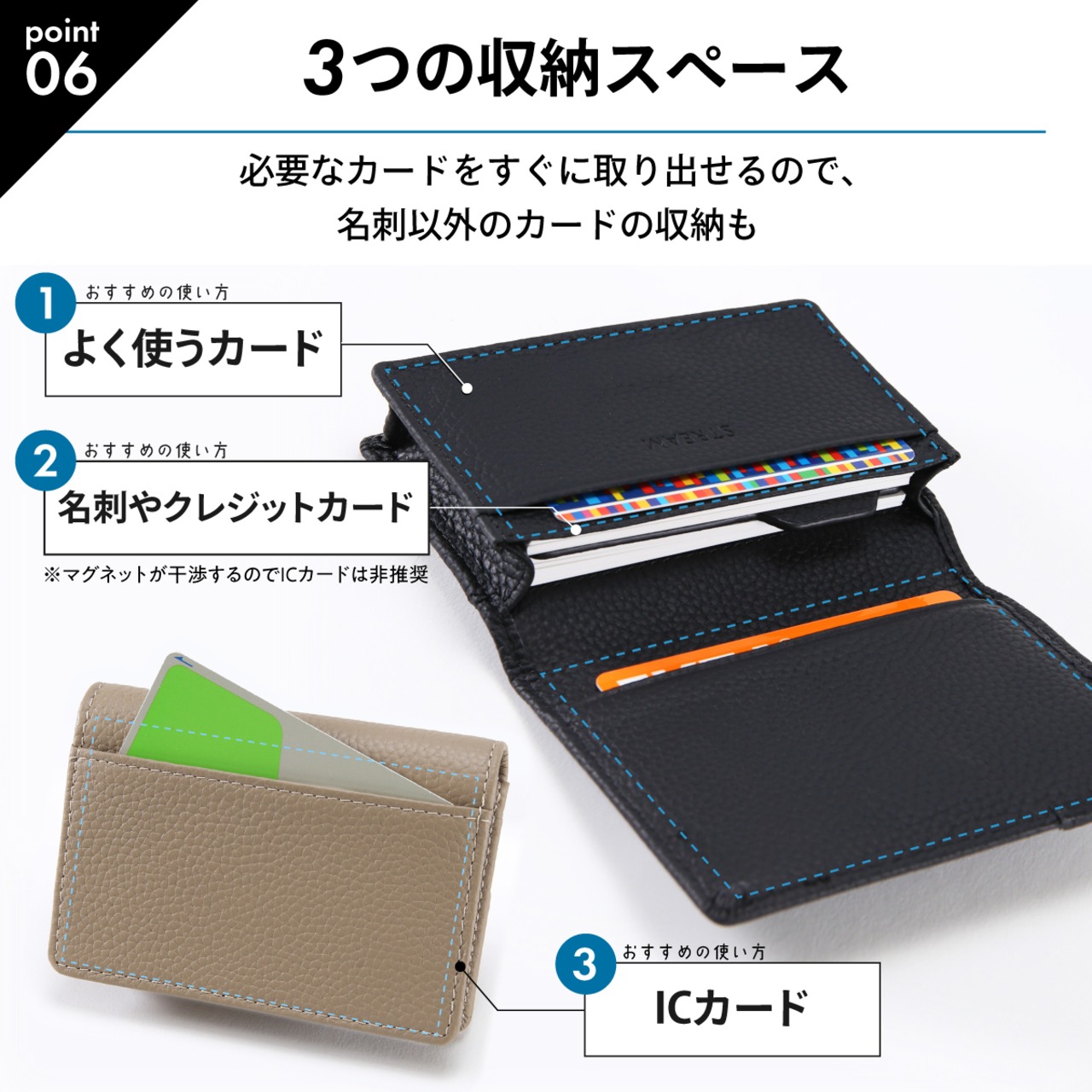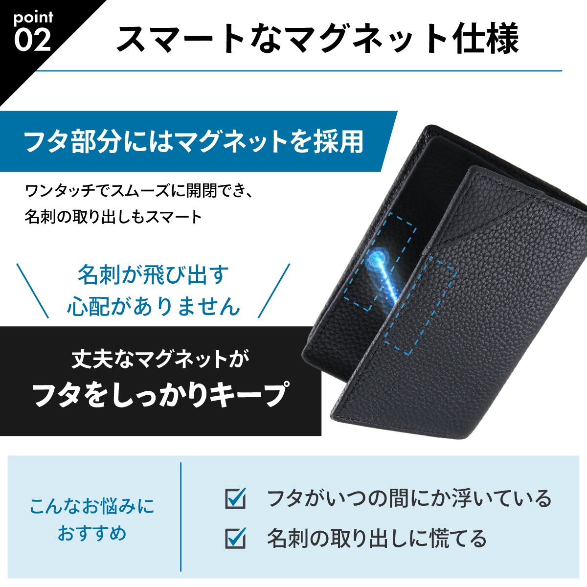 【マグネット式でピタッと閉じる】名刺を70枚しっかり収納できる通しマチ設計の名刺入れです。